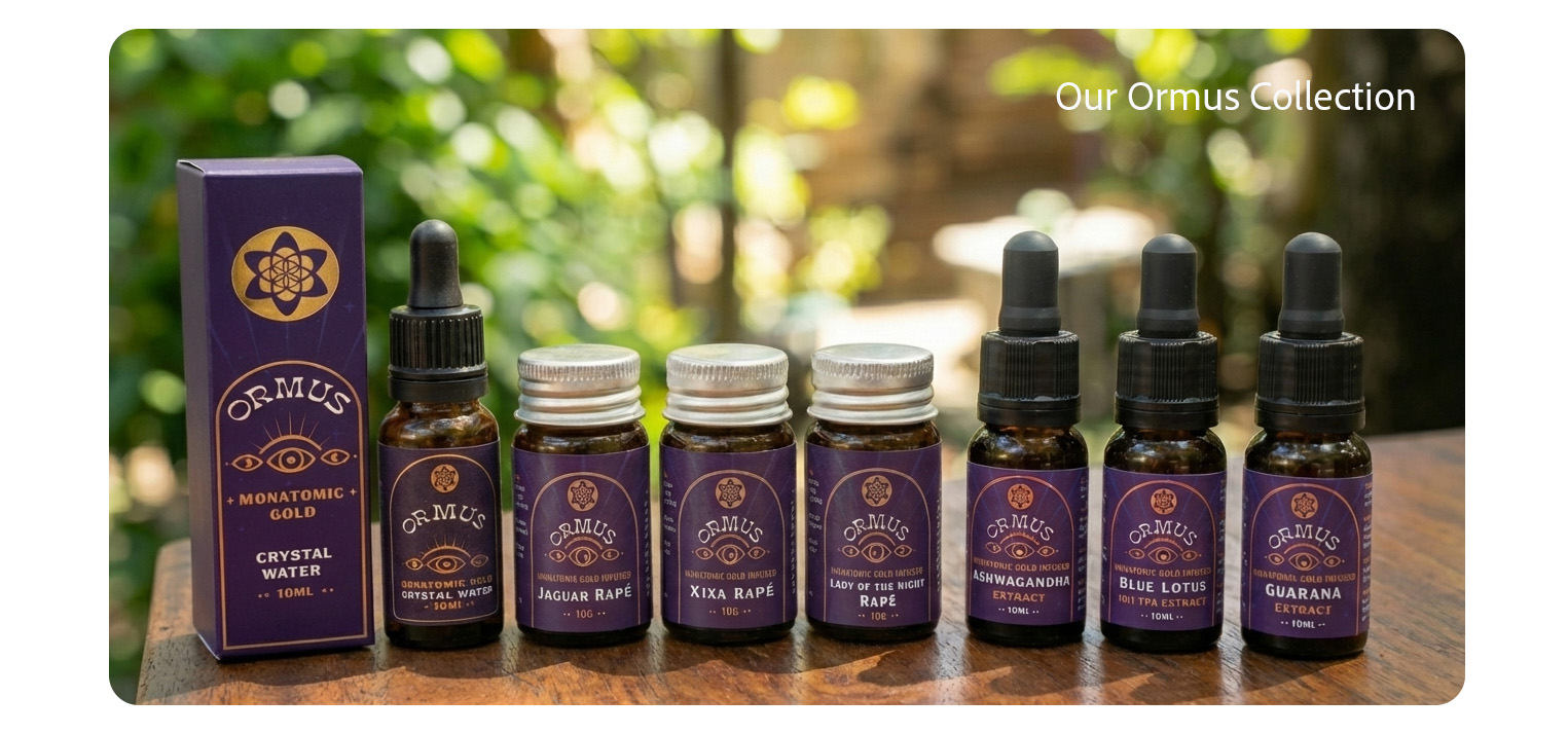 We've also developed Ormus-enriched rapés - traditional Amazonian snuff that gains an extra dimension through the addition of monoatomic gold. The Jaguar has strong masculine energy for clarity and focus, while Lady of the Night offers gentle feminine energy for inner work. The Spiritual Cleanse helps with energetic purification, Tsunu Full Power from Isaque Yawanawa provides deep grounding, and the Cacao rapé from the Huni Kuin combines cacao energy with Ormus clarity.