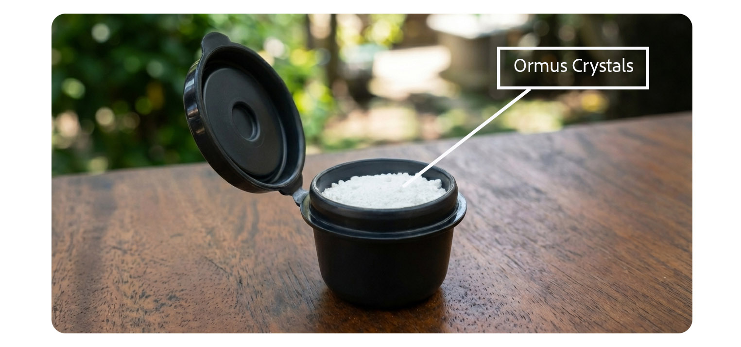 Real Ormus crystals are pure white and form after weeks of natural evaporation. They dissolve completely in water without residue. The water must come from a verified source - not just "ocean water" without further specification, but water from a specific location and depth. The production process should be transparent, including which extraction method was used.