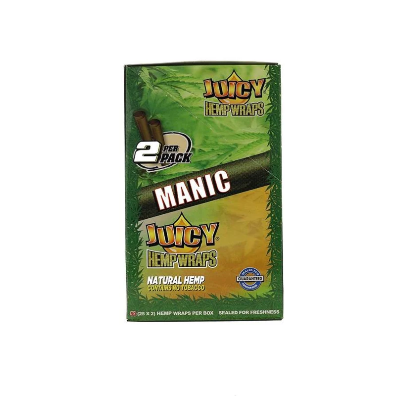 Juicy Hemp Wraps in Manic Mango Papaya Twist flavor. Made from 100% hemp without tobacco. The tropical flavor of mango and papaya makes each session extra special. Two wraps per pack. Burns slowly and evenly.