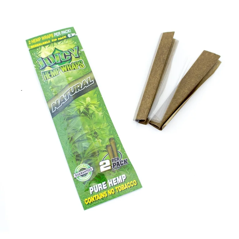 Juicy Hemp Wraps Natural without added flavor. Pure hemp without tobacco or nicotine. For those who want to taste the natural flavor of their herbs without extra aroma. Two wraps per pack. Burns slowly and evenly.