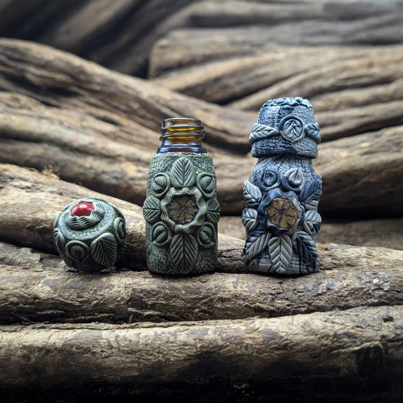 A 10ml glass bottle forms the base of this container, but what you see is the artwork around it. The Tete Pawã collective from the Brazilian Amazon makes these decorations with special clay, applied layer by layer around the glass. The patterns are deeply carved: feathers running along the sides, circular symbols, triangles and spirals. Some have a jade-green hue, others are dark grey or blue - the colors come from natural pigments mixed with the clay.