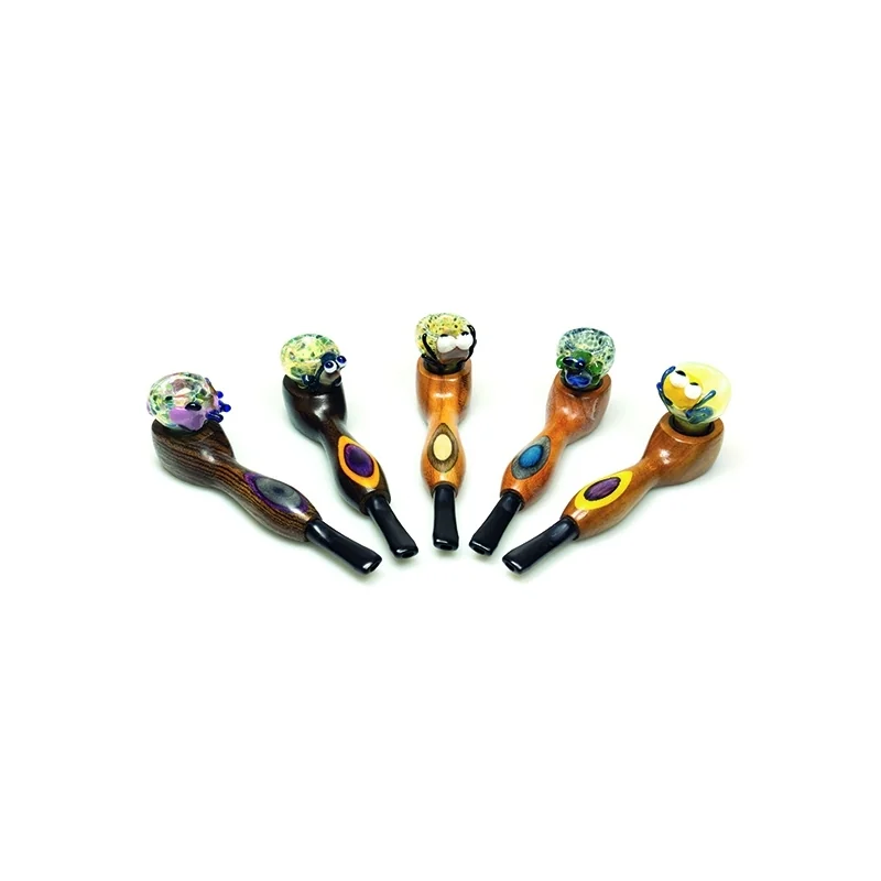 The wooden section forms the body and gives the pipe its artistic animal shape, while the glass component functions as the smoking chamber where material is placed and heated. This combination uses the strengths of both materials: the durability and warm character of wood with the heat resistance and flavour neutrality of glass.