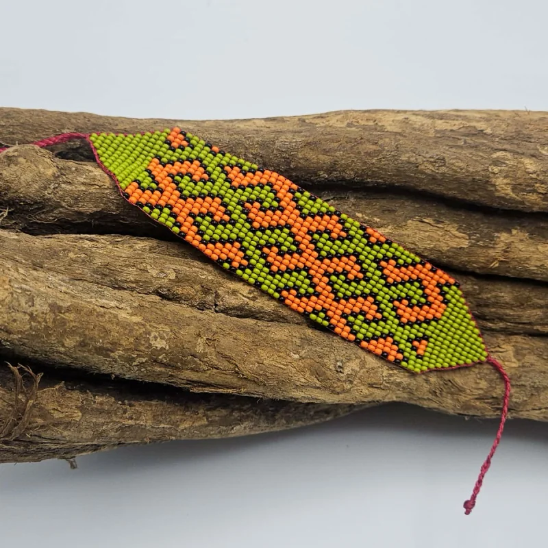 De naam Huni Kuin betekent "ware mensen" of "mensen met tradities". De vrouwen werken twee tot vier dagen aan één armband. Dit stuk heeft een bordeauxrood koord aan de uiteinden, wat een subtiel maar mooi contrast vormt met het groen-oranje design. De geometrische patronen lopen vloeiend in elkaar over.