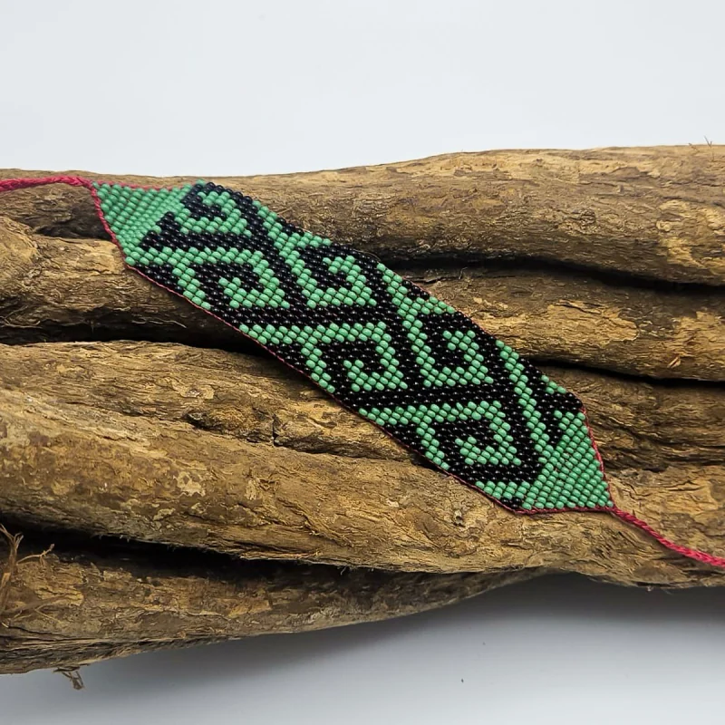 Deze kralenarmband komt uit de Braziliaanse Amazone, waar vrouwen van de Huni Kuin-stam ze met de hand rijgen. Dit exemplaar onderscheidt zich door zijn ingetogen elegantie: mintgroen en zwart, meer niet. De ruitvormige patronen zijn strak en evenwichtig. Het bordeauxrode koord aan de uiteinden voegt net een vleugje warmte toe aan het koele design.