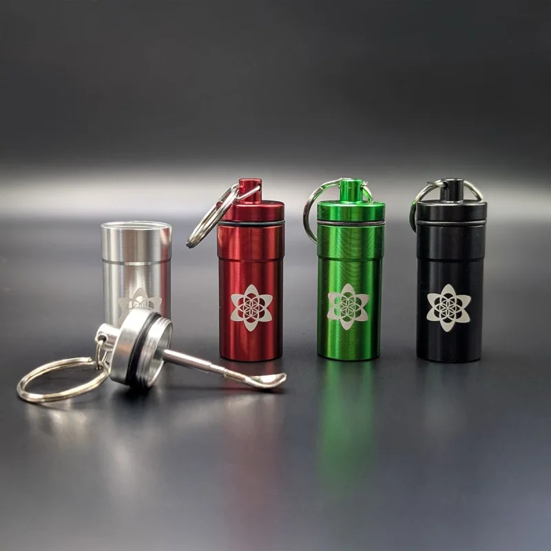 De metalen voorraadkoker is ontworpen voor het discreet en veilig opbergen van poeders, fijngemalen kruiden of andere droge producten. De ingebouwde uitschuiflepel maakt het mogelijk om onderweg nauwkeurig kleine hoeveelheden te doseren zonder extra accessoires mee te hoeven nemen. Dankzij de waterdichte en geurvrije constructie blijft de inhoud beschermd tegen vocht en geuren, wat het ideale opbergaccessoire maakt voor festivals, reizen of dagelijks gebruik.